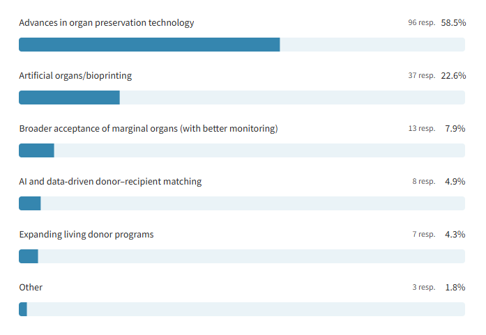 Organ preservation technology emerged as the clear frontrunner, receiving more than half of all votes. Respondents consistently emphasized how advancements in preservation have already reshaped transplant medicine, extending viability windows and reducing geographic limitations.