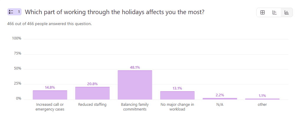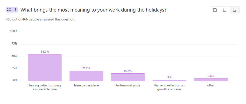 More than half of respondents (54.7%) pointed to serving patients during vulnerable moments as the most meaningful aspect of working through the holidays, reinforcing the core purpose that defines the profession. Even during a time of year often associated with personal commitments and time off, patient care remains the central anchor that gives holiday work its significance.
