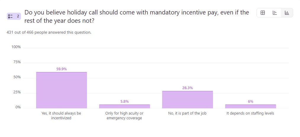 This split underscores a broader tension between compensation and commitment. While most respondents favor recognizing holiday call with added pay, others emphasize that it remains a fundamental expectation of the job. The smaller segments of responses suggest that factors like staffing levels and clinical acuity can further shape how individuals interpret fairness when it comes to incentive structures.