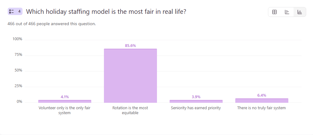 While a smaller portion of respondents pointed to volunteer-based, seniority-based, or even the idea that no system is entirely fair, these perspectives highlight that fairness can be interpreted in different ways depending on team structure and individual expectations. Still, the overall sentiment is clear: rotation is widely viewed as the most practical and balanced way to navigate holiday coverage while maintaining team cohesion.